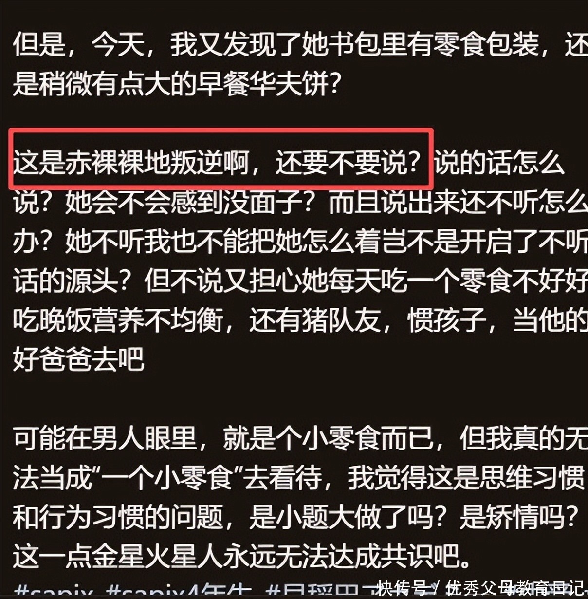 于是跟爸爸一合计,觉得放学这么久又好好学习了,给自己买一点零食也算是犒劳自己,这不过分吧,但是这在母亲看来竟然就成了所谓的赤裸叛逆。