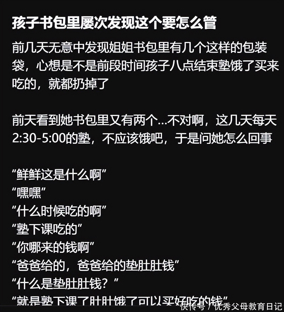 这不就是一个小零食吗,于是这个母亲在神经紧张的东问西问之后,好不容易拼拼凑出了事实,其实就是女孩子下课肚子饿了,但是又不能及时回家。